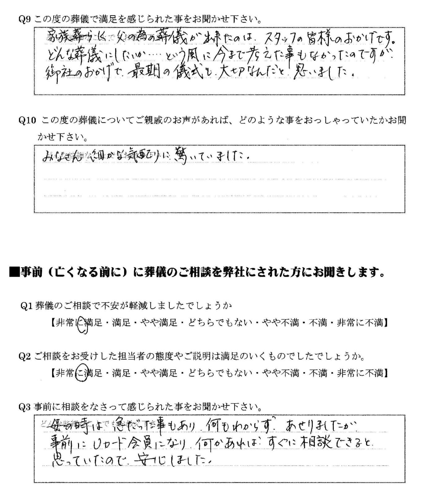 家族葬らしく父のための葬儀が出来たのはスタッフの皆様のおかげです。どんな葬儀にしたいか……という風に今まで考えたこともなかったのですが、御社のおかげで最期の儀式も大切なんだと思いました