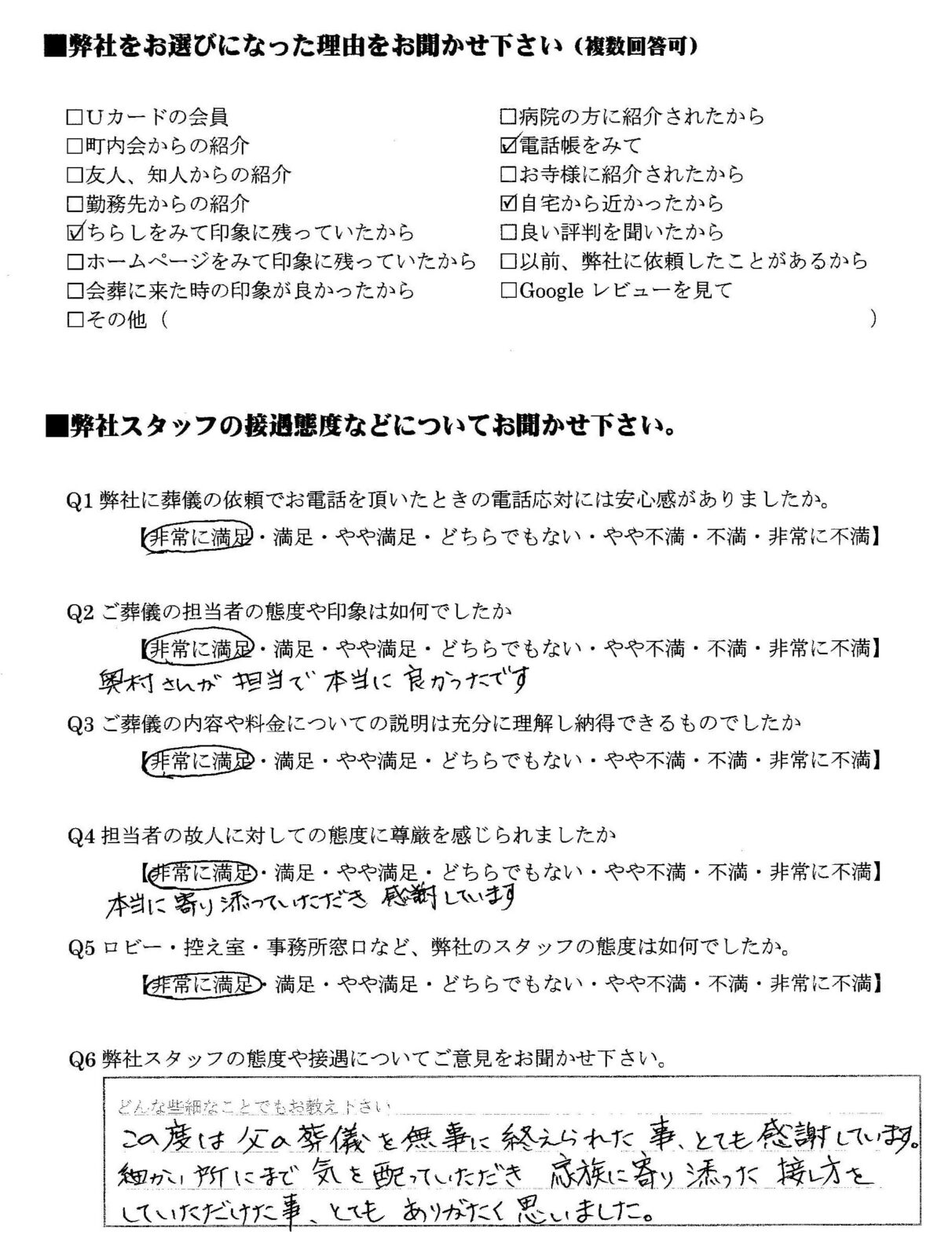 この度は父の葬儀を無事に終えられたこととても感謝しています。細かい所にまで気を配っていただき、家族に寄り添った接し方をしていただけたこと、とてもありがたく思いました。